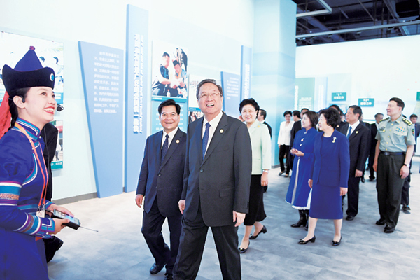 8月的青城呼和浩特,碧空如洗,微风和煦。内蒙古展览馆前广场上,奔跑的蒙古马雕塑象征着自治区各项事业一往无前、蒸蒸日上;主楼两侧,用蒙汉两种文字书写的“热烈庆祝内蒙古自治区成立70周年”“以优异成绩迎接党的十九大胜利召开”标语格外醒目。 庆祝内蒙古自治区成立70周年展览以党中央对内蒙古自治区的亲切关怀开篇,分为“革命风云·建立我国第一个少数民族自治区”“艰苦创业·民族区域自治的探索与实践”“扬帆起航·开创改革开放现代化建设新局面”“抢抓机遇·实现新世纪新阶段发展新跨越”“守望相助·打造祖国北疆亮丽风景线”等五个单元,充分反映了内蒙古自治区成立70年来,在中国共产党的坚强领导下,在党的民族区域自治政策光辉照耀下,草原儿女守望相助团结奋斗取得的历史性成就。 上午10时40分许,俞正声等步入展厅,参观展览。“五一会址”实景复原、周恩来总理为包钢一号高炉出铁剪彩的照片、绿色有机农畜产品展台、中蒙俄经济走廊规划建设示意图、反映不同年代居民生活环境变化的泥塑……一件件文献和实物、一幅幅图片和图表、一组组模型和多媒体展示,反映了内蒙古自治区的发展历程。俞正声一边仔细观看展品,一边认真听取讲解,不时驻足观看,详细询问和了解有关情况。 党的十八大以来,内蒙古自治区全面落实习近平总书记对内蒙古工作的重要指示和要求,特别是在内蒙古考察时的重要讲话精神,开创改革开放和现代化建设崭新局面,打造祖国北疆亮丽风景线迈出坚实步伐。参观展览过程中,俞正声了解到内蒙古自治区近年来在经济转型升级、民族团结进步、脱贫攻坚、生态安全等方面取得的新成绩,频频点头,表示肯定。 中央代表团副团长刘延东、孙春兰、张平、王正伟、张阳和代表团全体成员以及自治区领导李纪恒、布小林、任亚平、冷杰松、李佳、白玉刚、罗永纲、刘新乐、马明等一同参观展览。 |